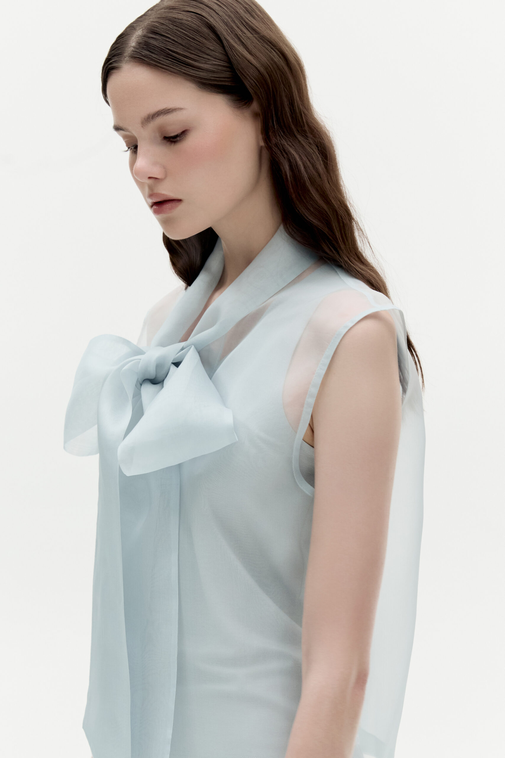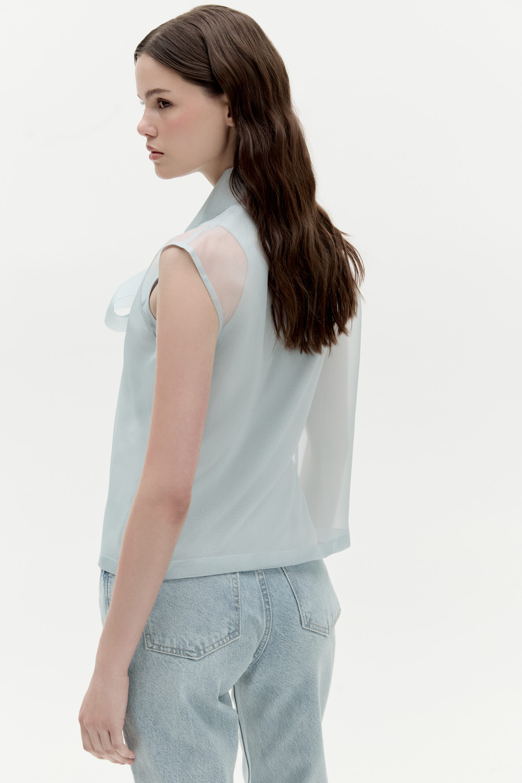Bluzka Mila została wykonana z transparentnej tkaniny jedwabnej. Ozdobiona została doszytymi na stałe szarfami, które dają kilka możliwości stylizacji. Do bluzki w komplecie sprzedawany jest top, który można nosić również oddzielnie.