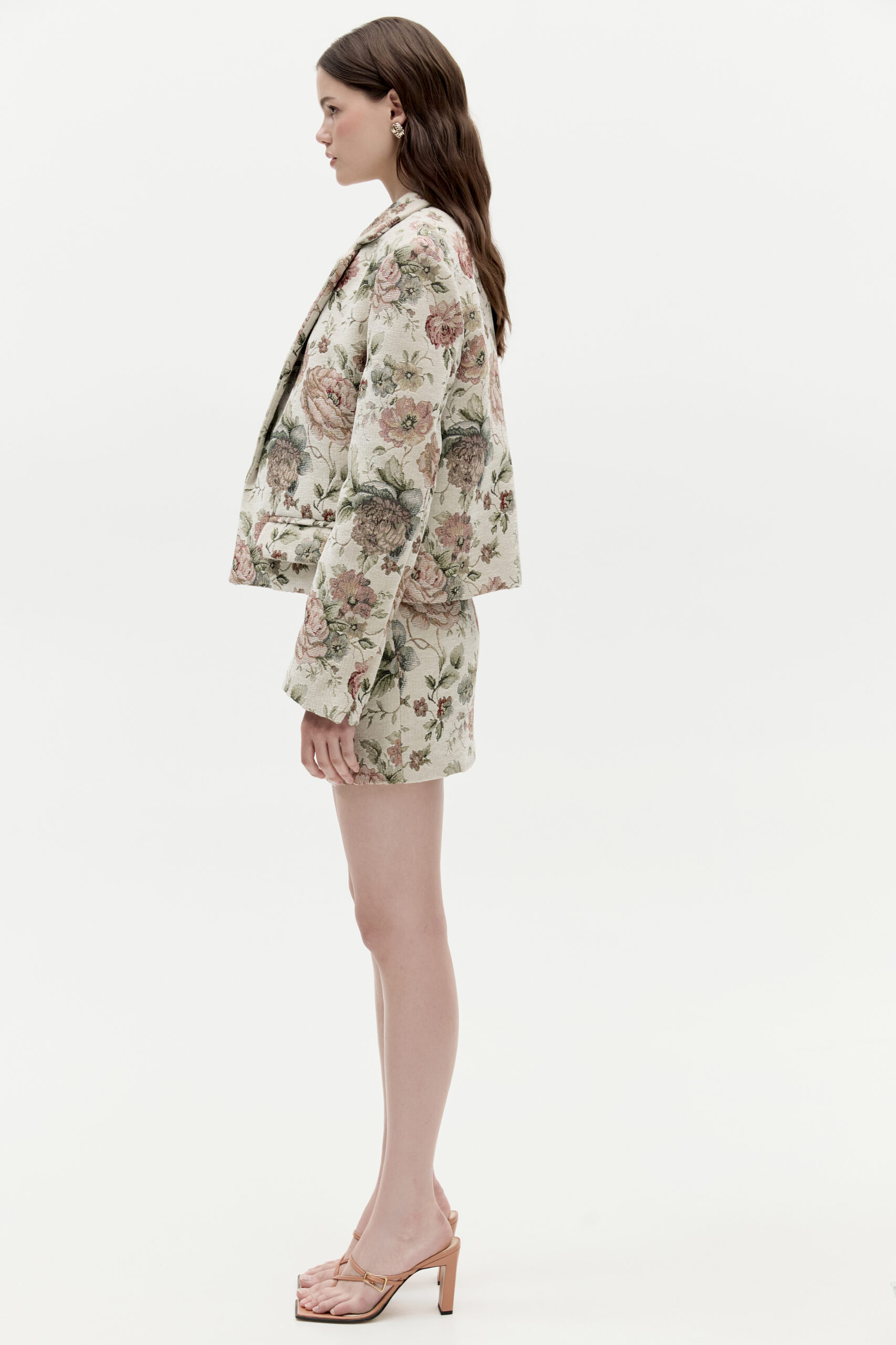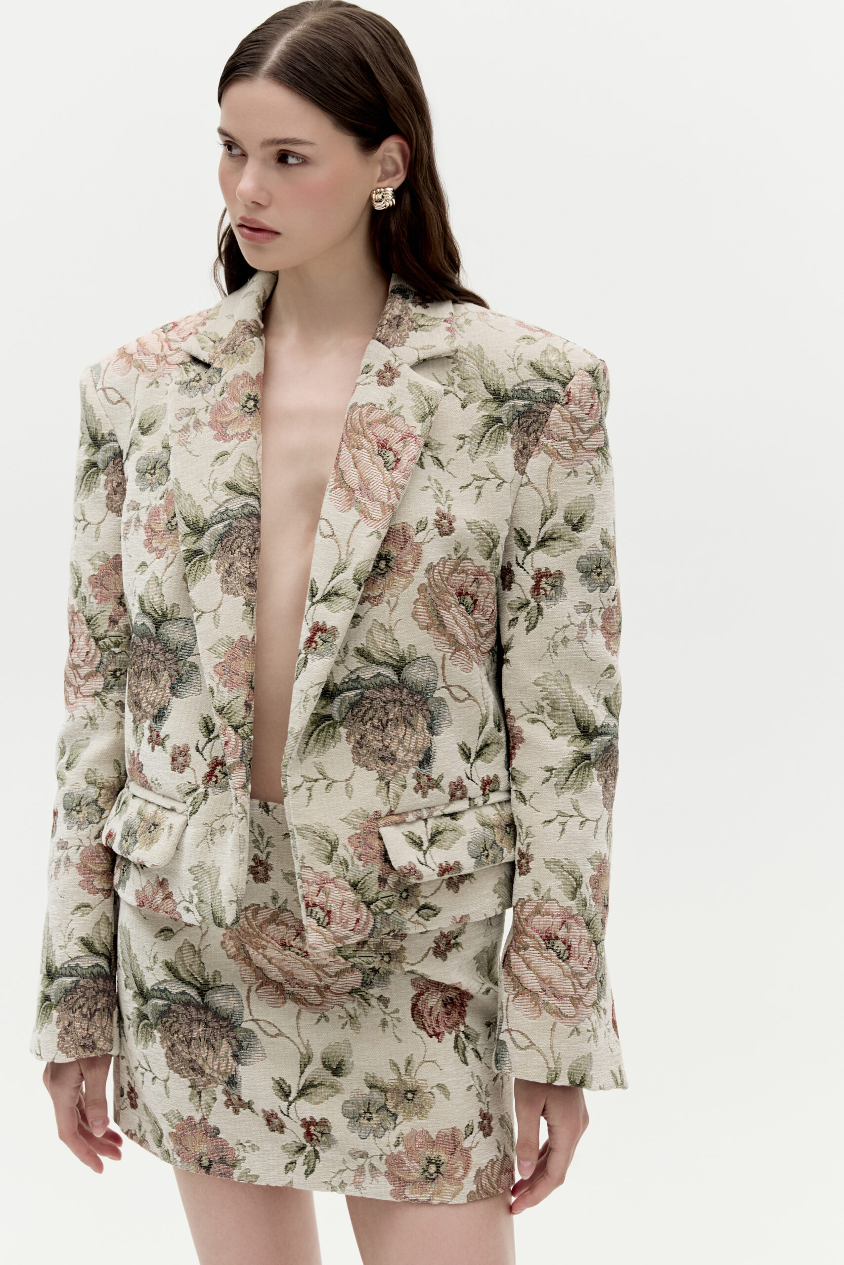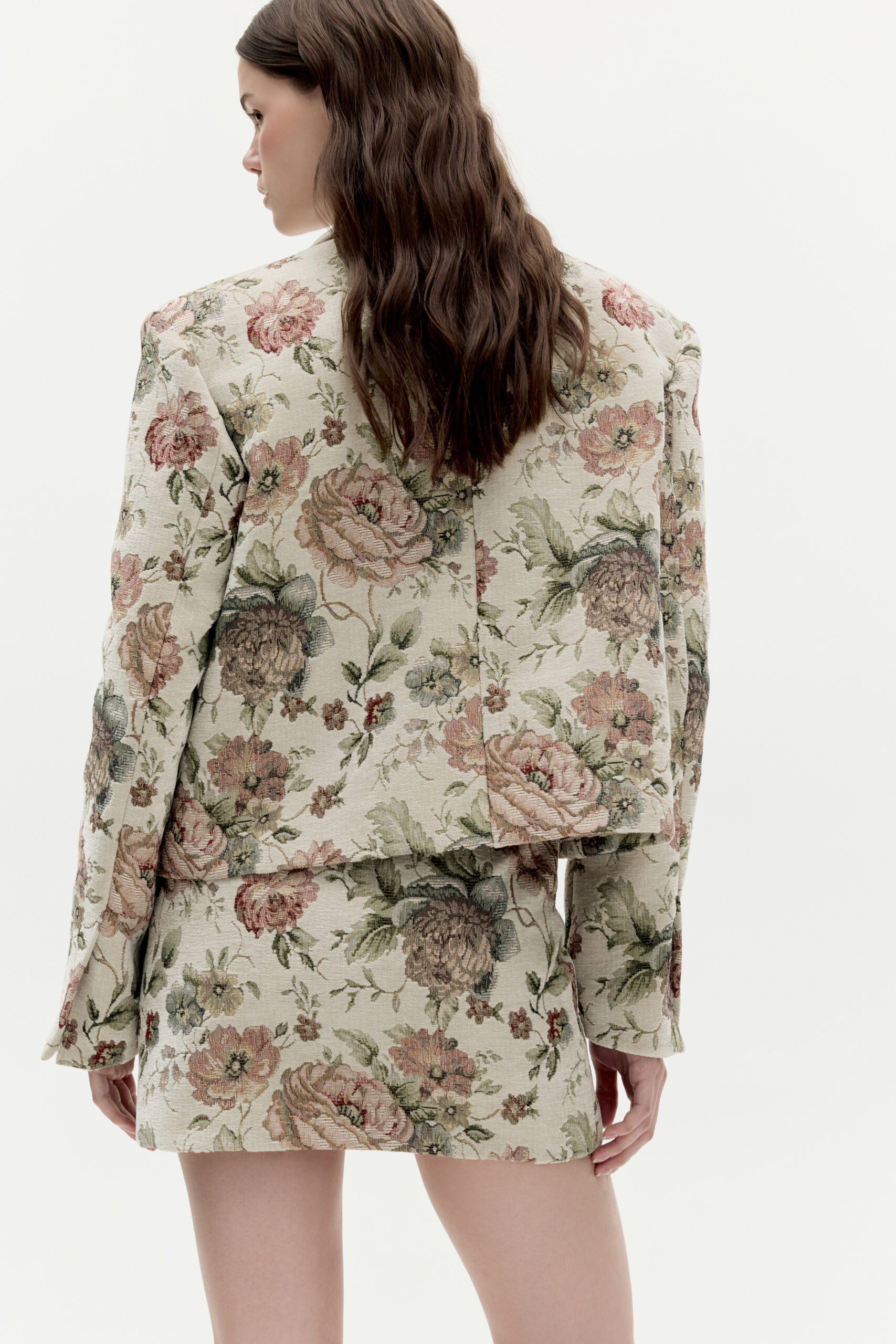 Marynarka Florence to klasyczna forma o skróconym kroju. Została ozdobiona delikatnym kołnierzem, kieszeniami oraz charakterystycznymi pęknięciami na rękawach. Wykonana została z żakardowej tkaniny wzorzystej. Nie posiada zapięcia.