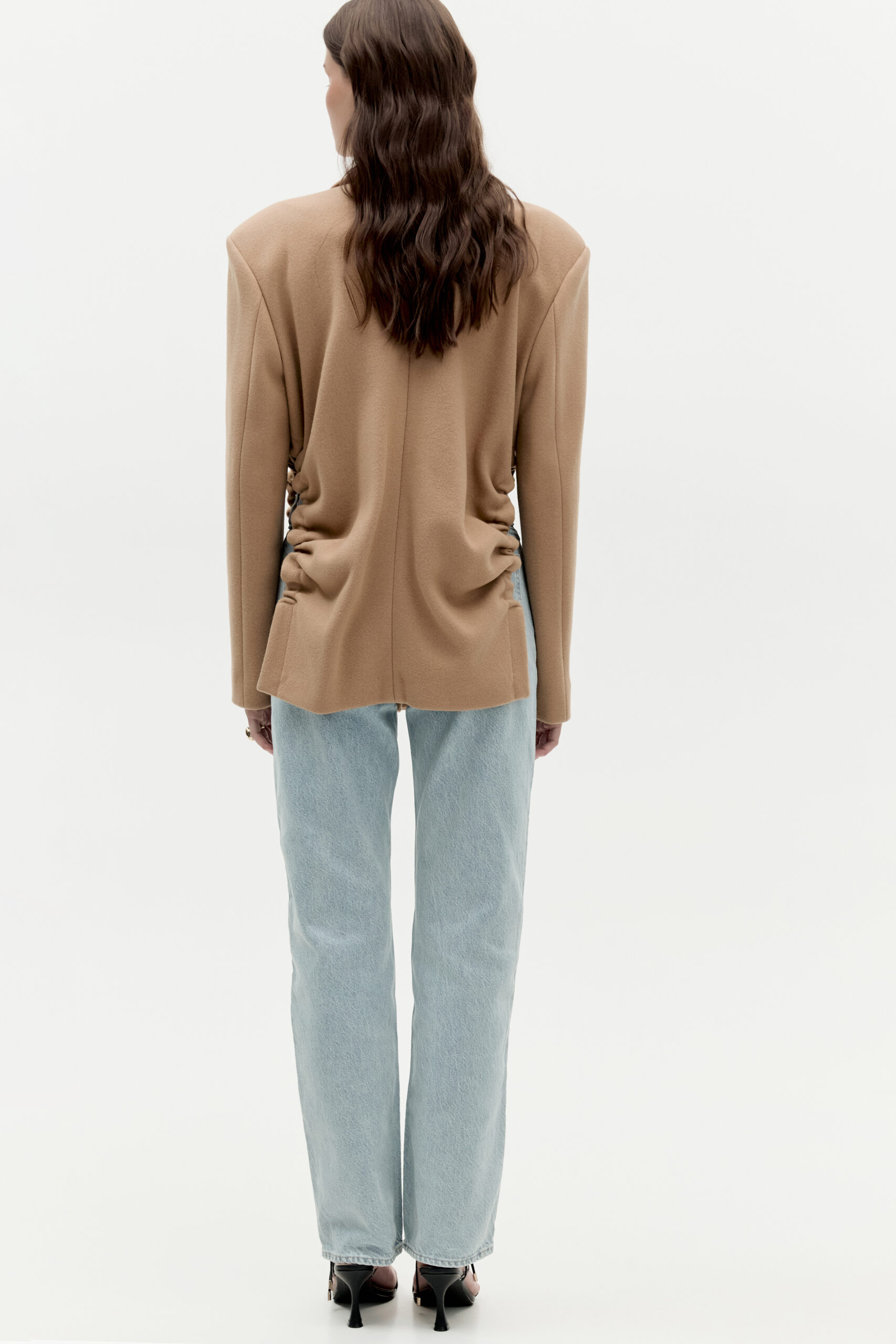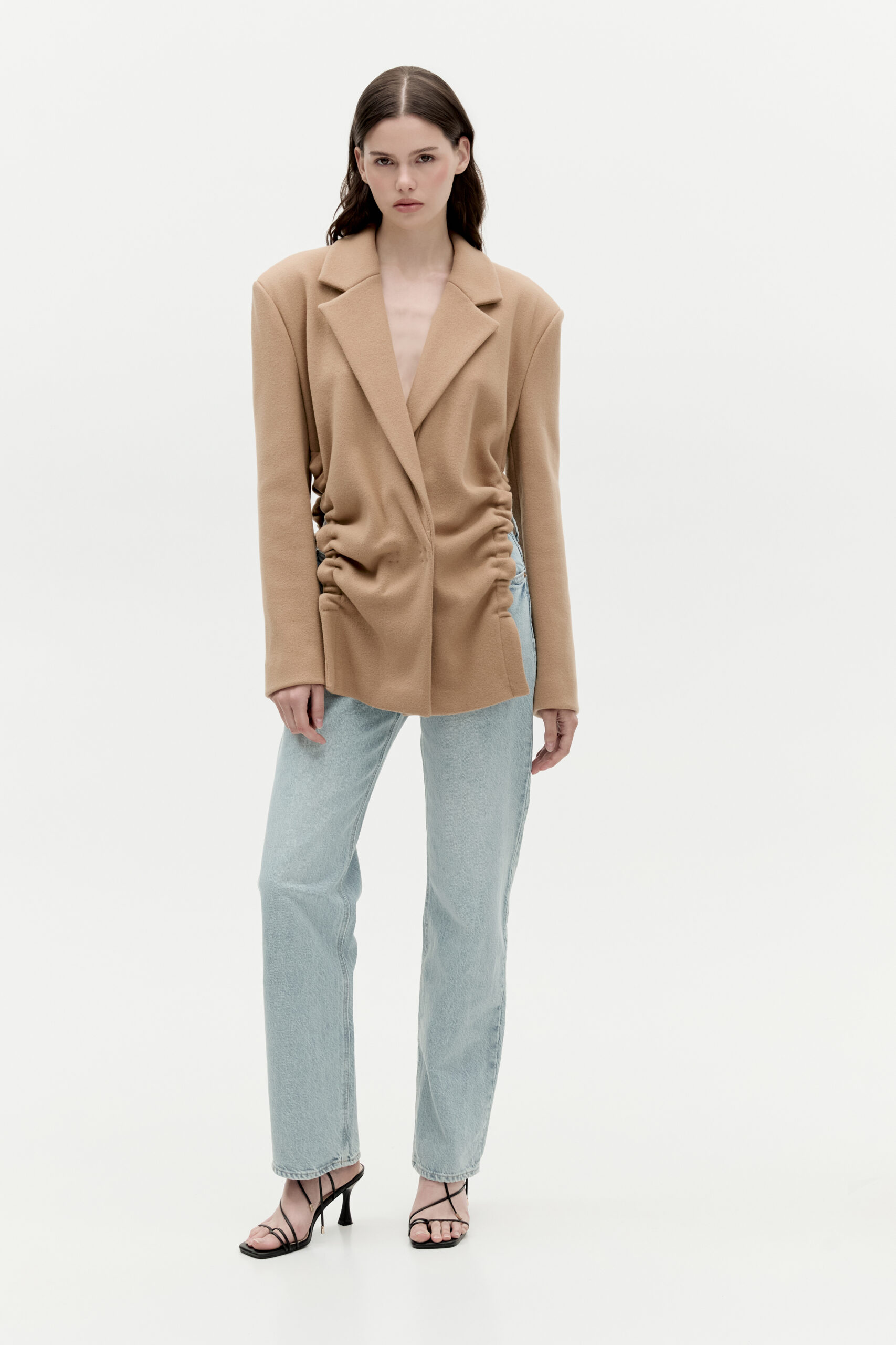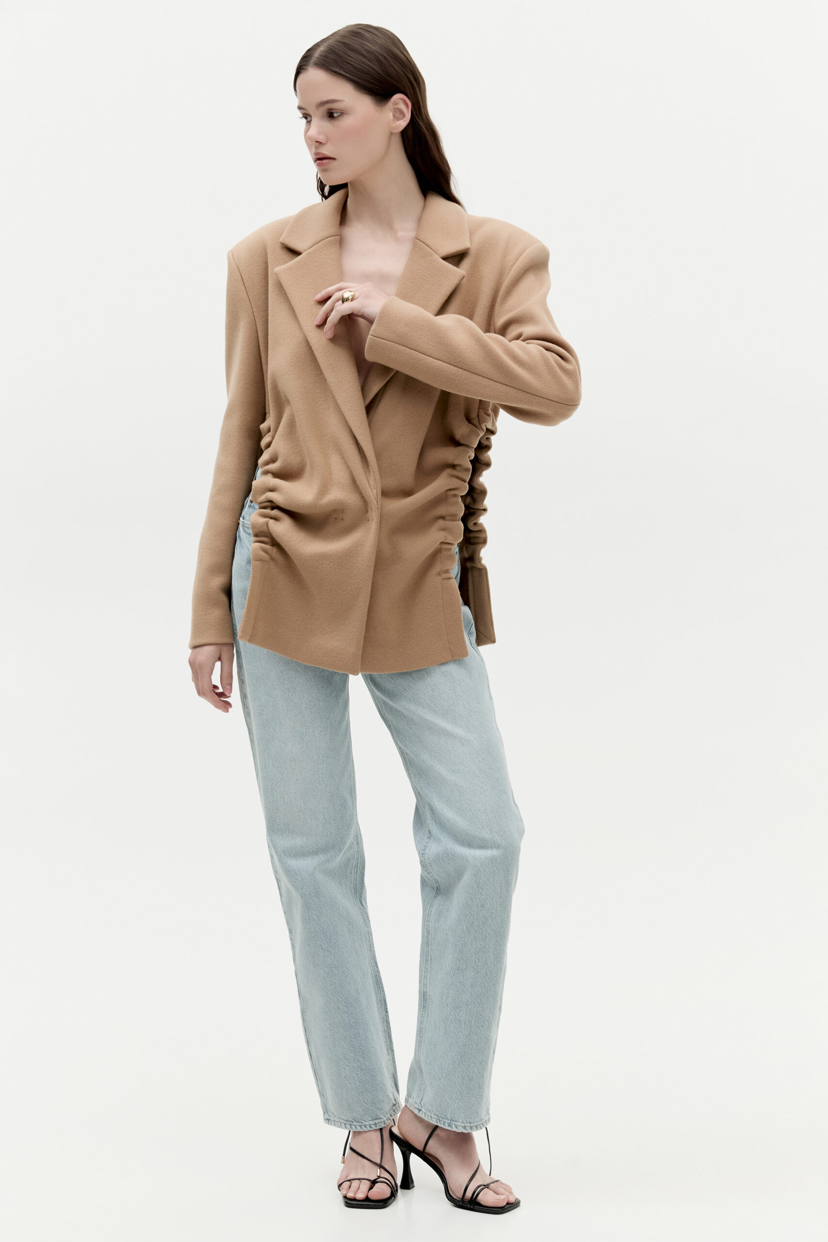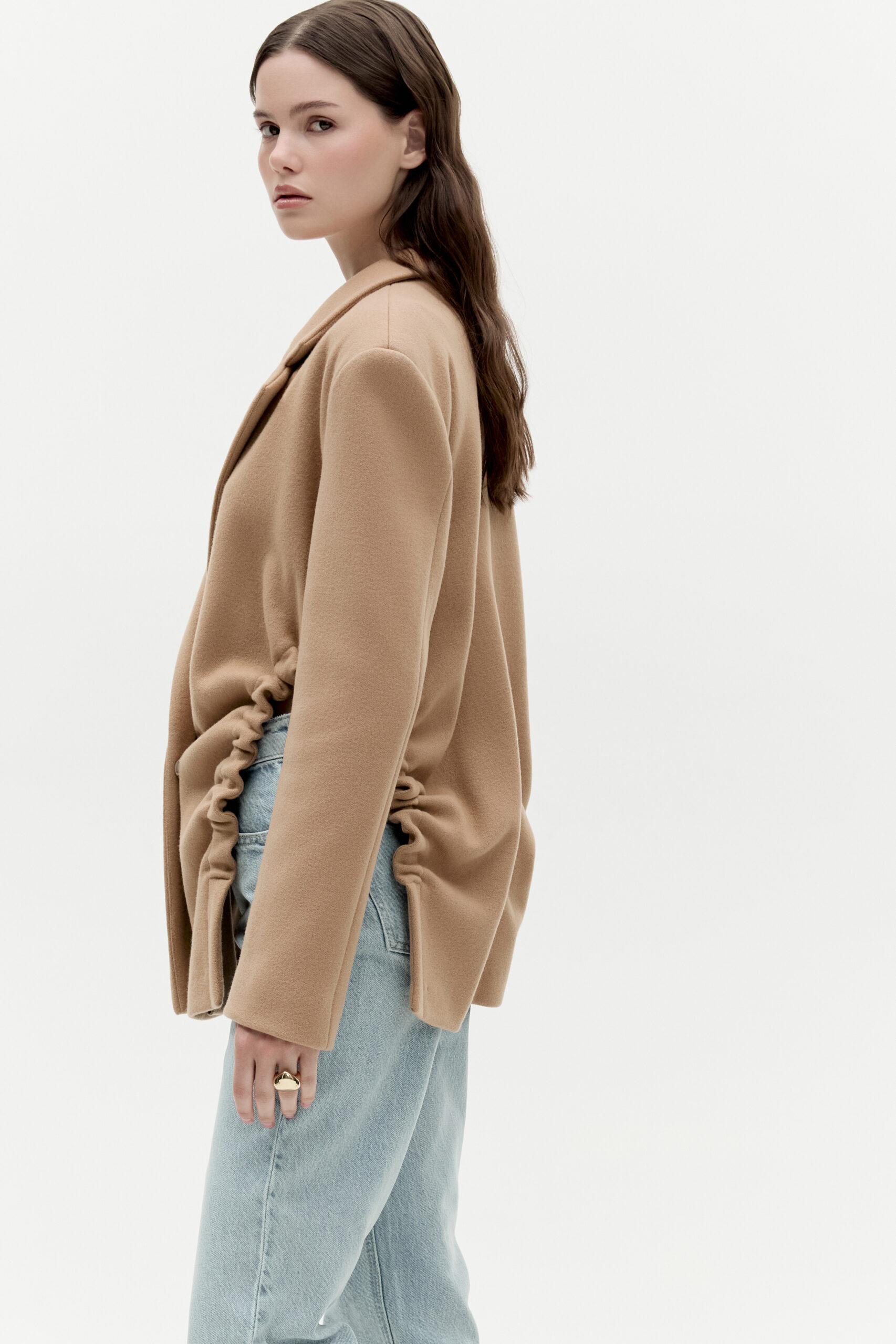 Marynarka Gigi to nowoczesna forma zaprojektowana na klasycznych podstawach. Podkreślone ramiona, delikatny kołnierz w połączeniu z niestandardowymi marszczeniami oraz dwurzędowe zapięcie na ozdobne zatrzaski. Została wykonana z włoskiej wełny z dodatkiem poliamidu. Podszewka występuje tylko na karczku marynarki. Marynarka Gigi powstaje indywidualnie oraz jest wykańczana i marszczona ręcznie. Z tego powodu marszczenie w marynarkach może się nieznacznie różnić.
