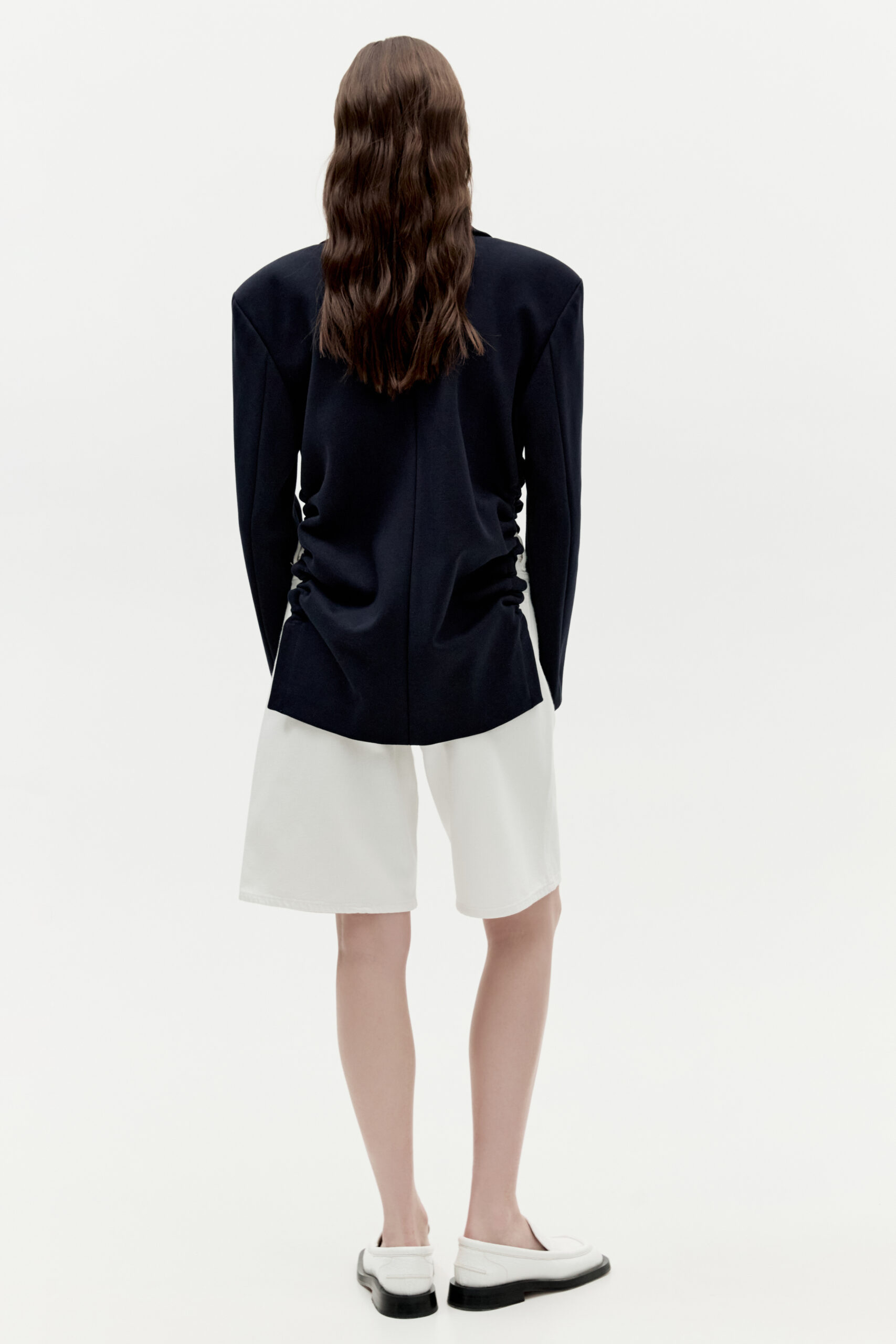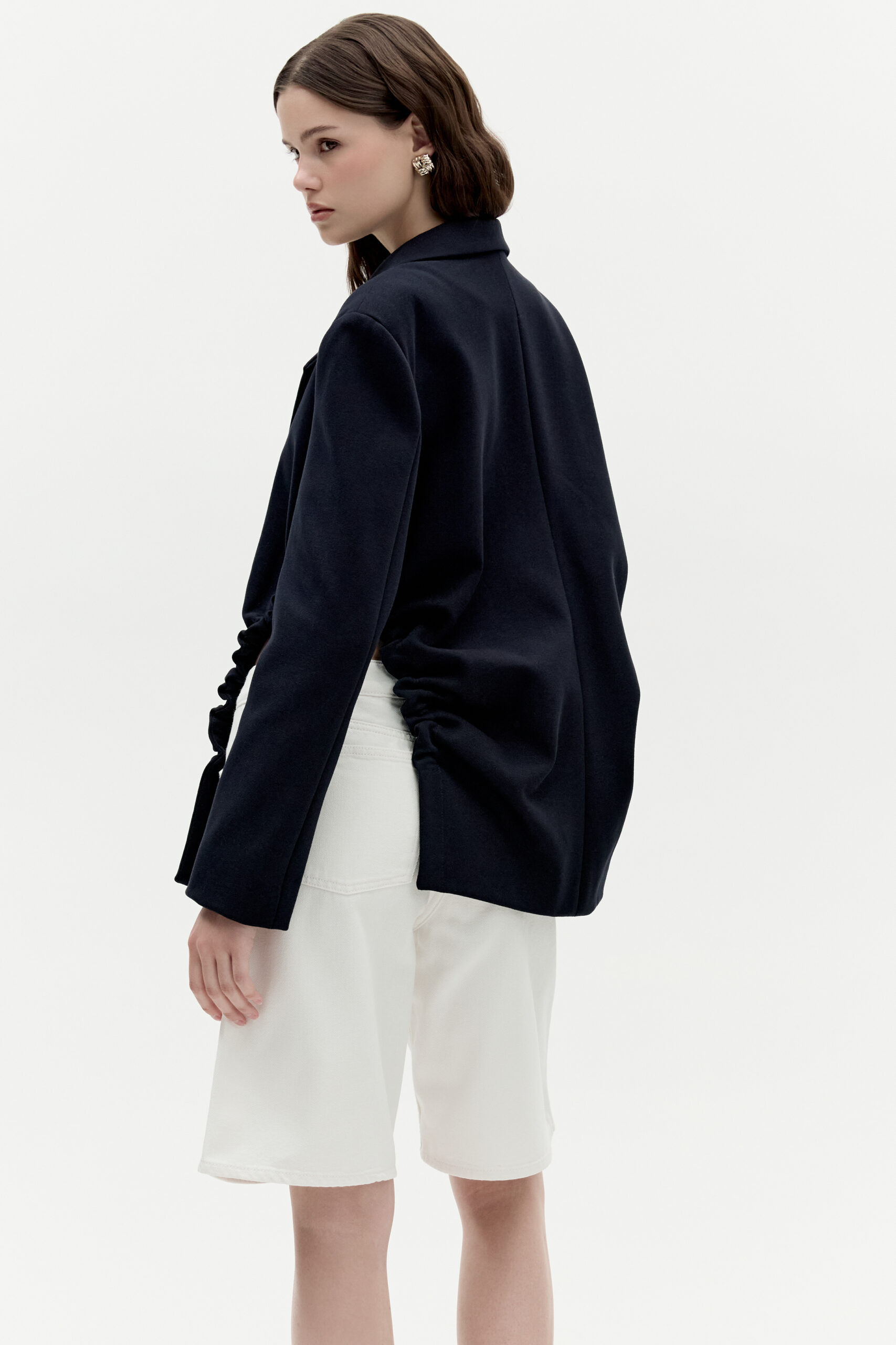 Marynarka Gigi Navy to nowoczesna forma zaprojektowana na klasycznych podstawach. Podkreślone ramiona, delikatny kołnierz w połączeniu z niestandardowymi marszczeniami oraz dwurzędowe zapięcie na metalowe zatrzaski. Plastyczny materiał podkreśla marszczone detale marynarki. Kolor granatowy. Marynarka Gigi powstaje indywidualnie oraz jest wykańczana i marszczona ręcznie. Z tego powodu marszczenie w marynarkach może się nieznacznie różnić.