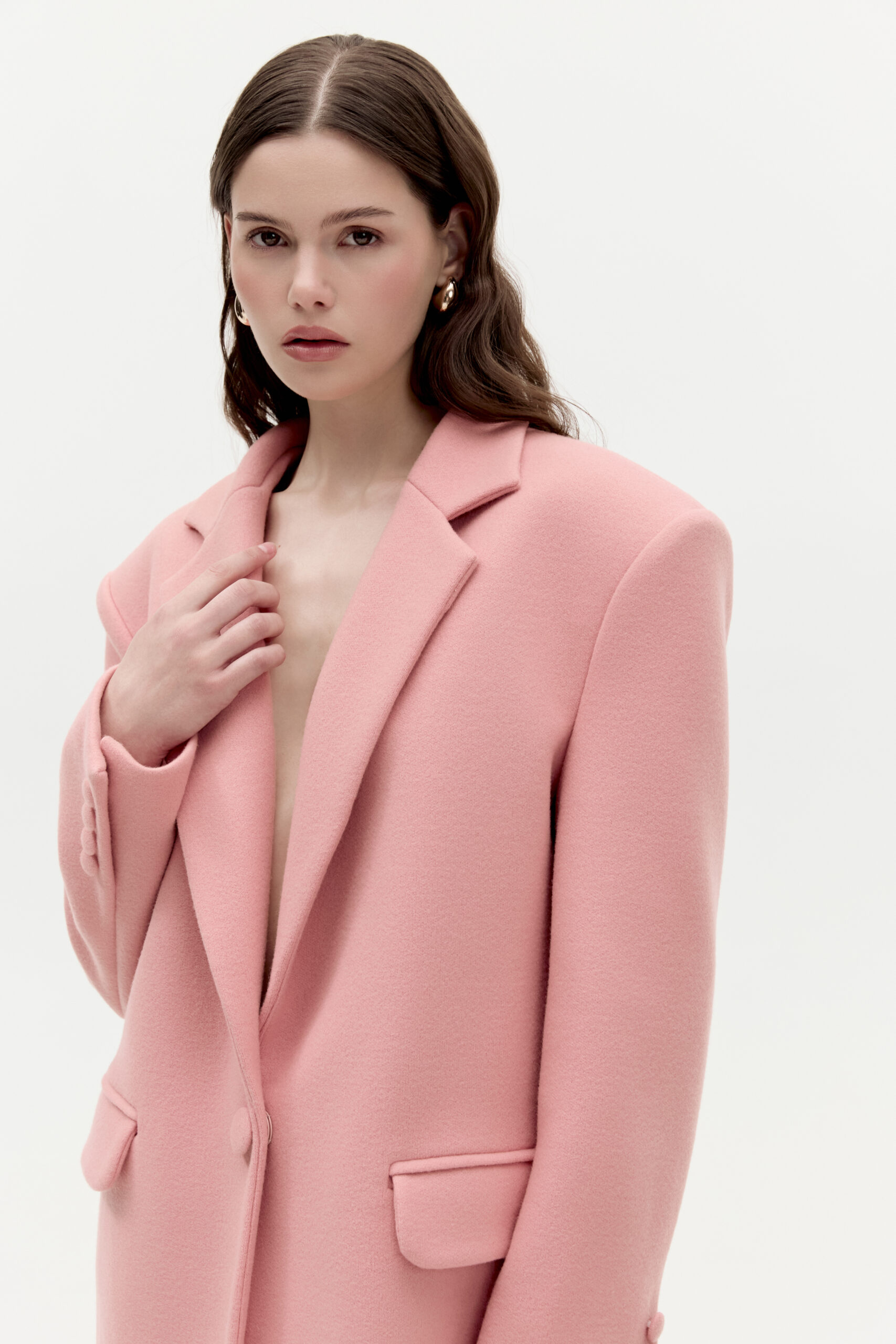 Reina to klasyczna konstrukcja marynarki z wyraźnie zaznaczoną linią ramion. Delikatny kołnierz, kieszenie oraz oblekane tym samym materiałem guziki. Wykonana została z wełny dziewiczej z dodatkiem poliamidu, sprowadzonej z Włoch. Posiada zapięcie na metalowy zatrzask w kolorze różowym.