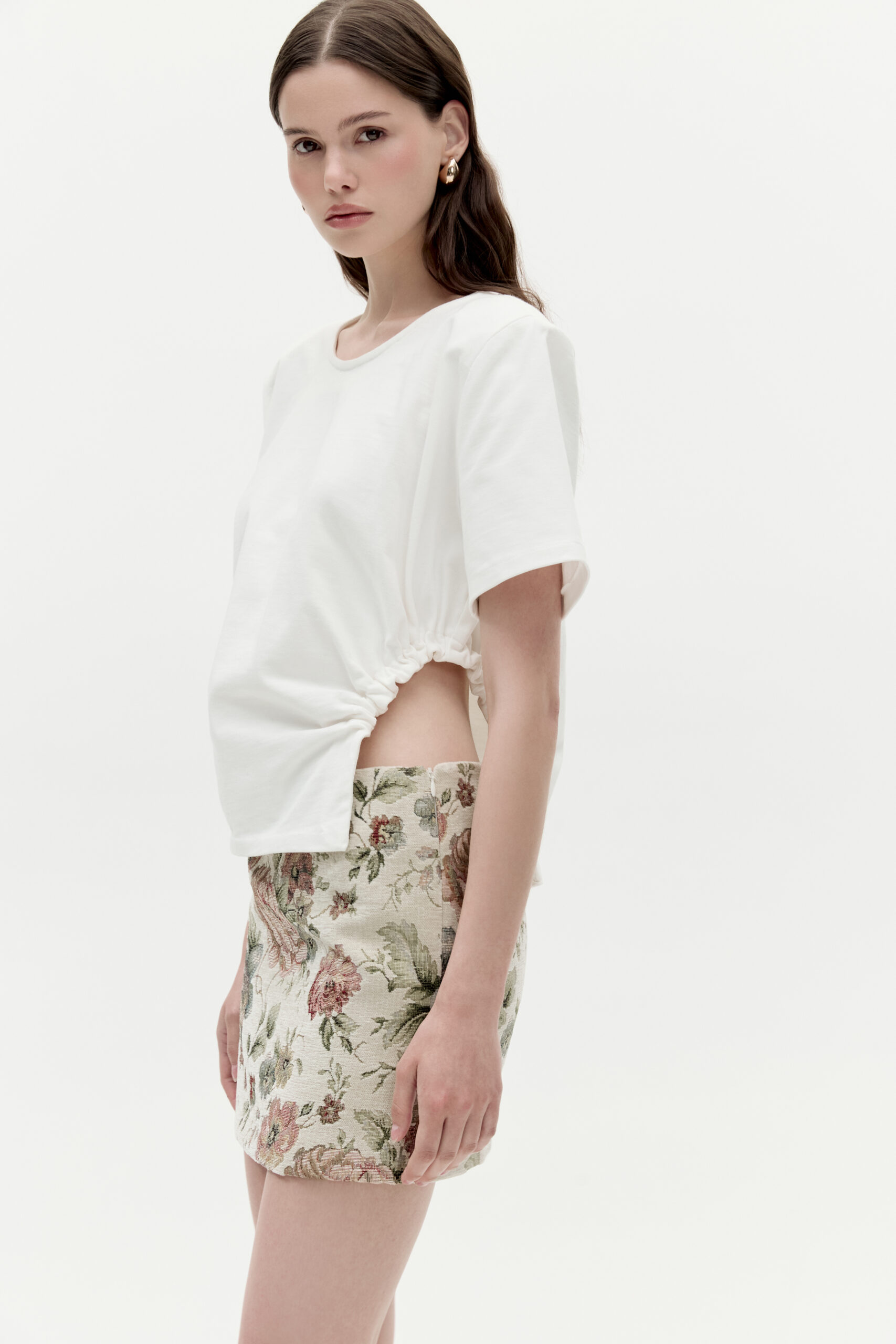 T-shirt Sofia to nowoczesna forma zaprojektowana na klasycznych podstawach. Podkreślone poduszkami ramiona w połączeniu z niestandardowymi marszczeniami. Śmietankowy odcień.
