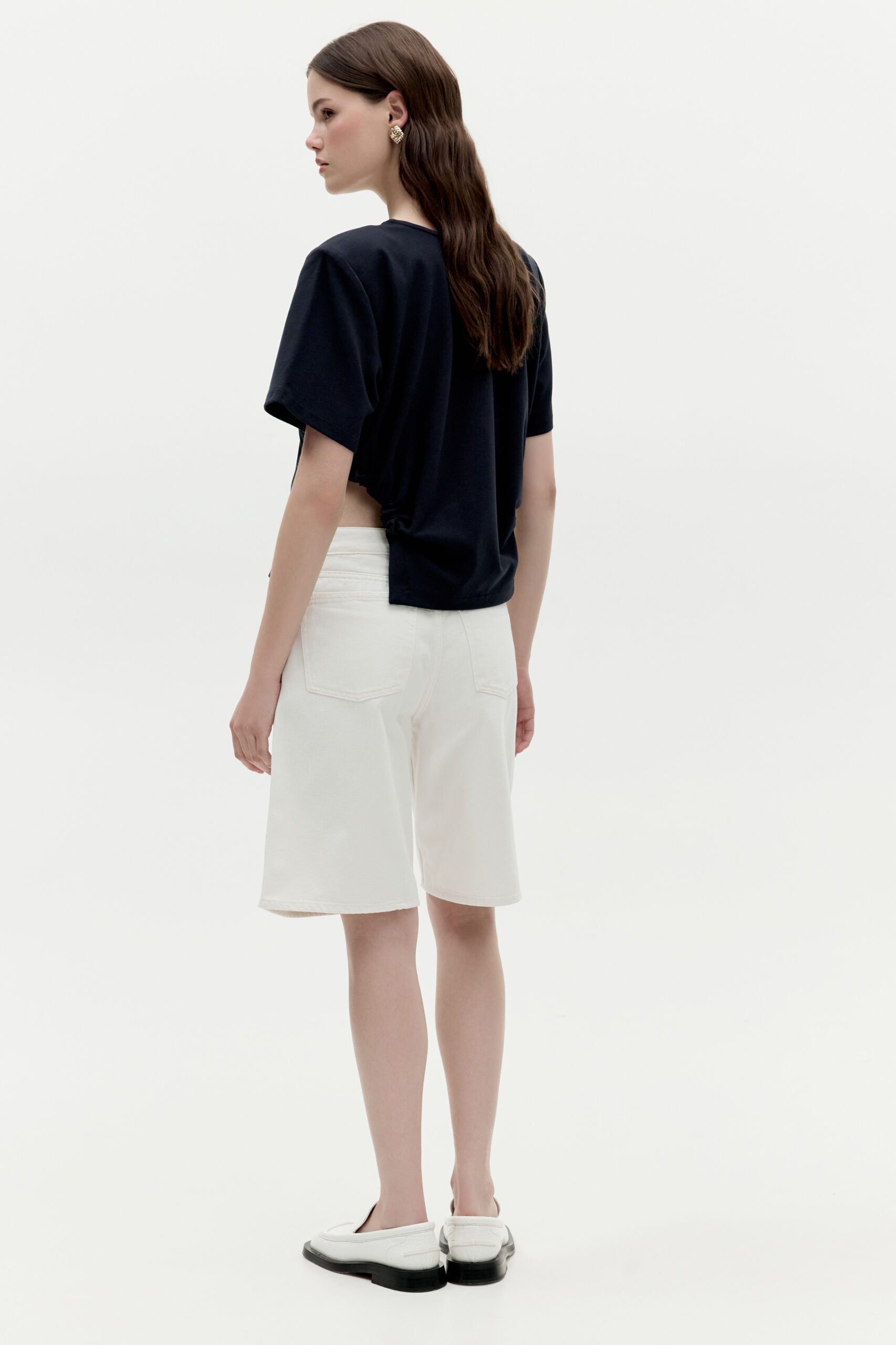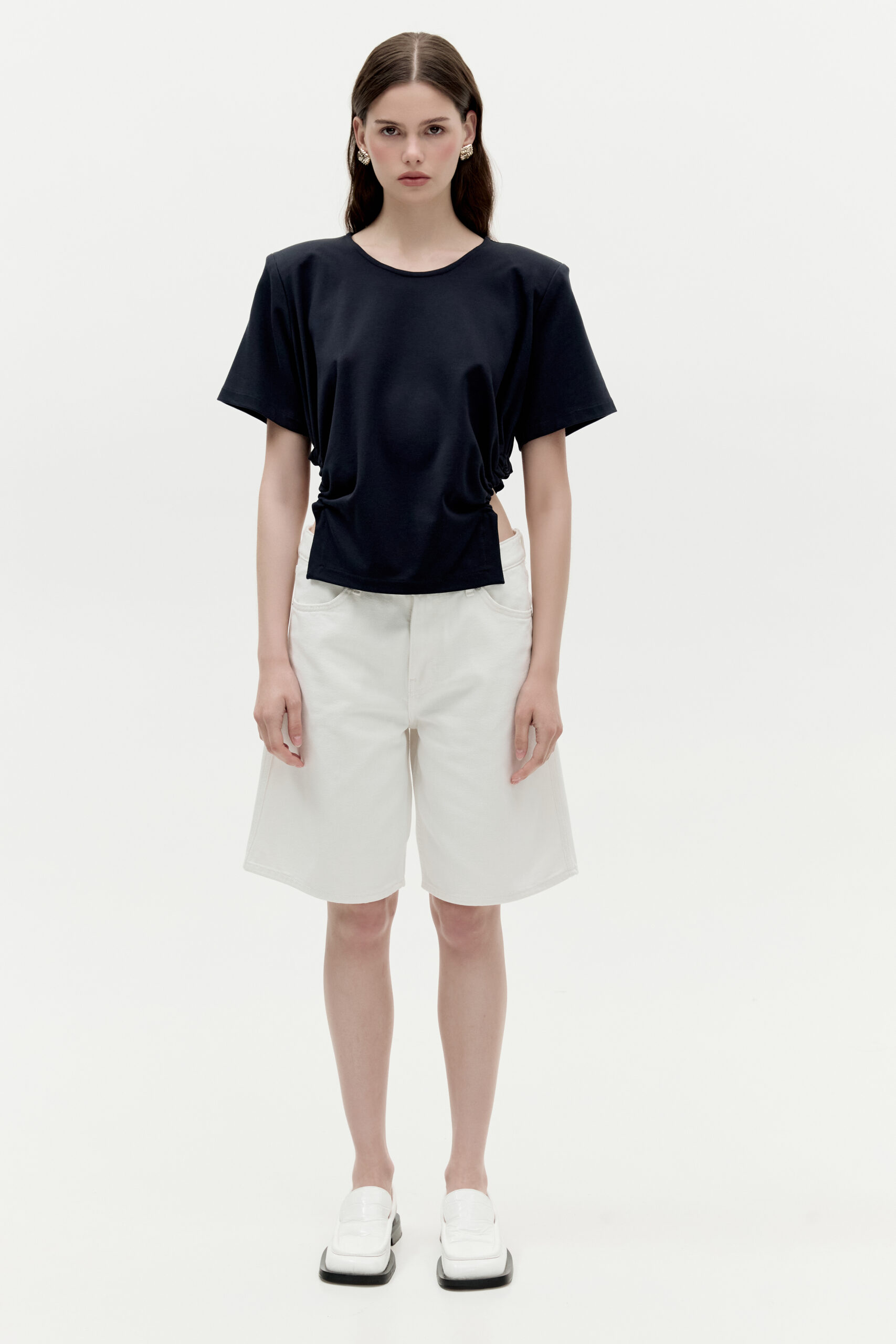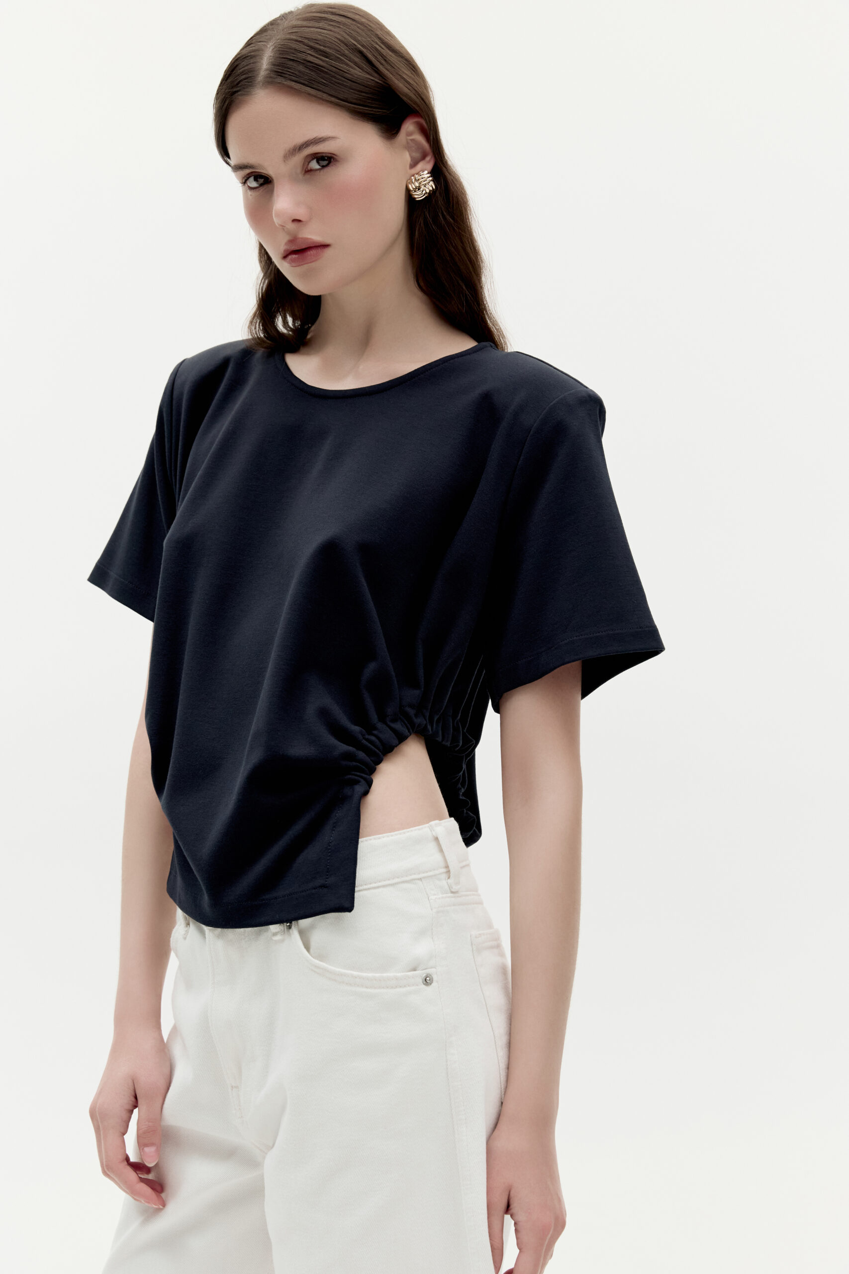 T-shirt Sofia Navy to nowoczesna forma zaprojektowana na klasycznych podstawach. Podkreślone poduszkami ramiona w połączeniu z niestandardowymi marszczeniami. Kolor granatowy.